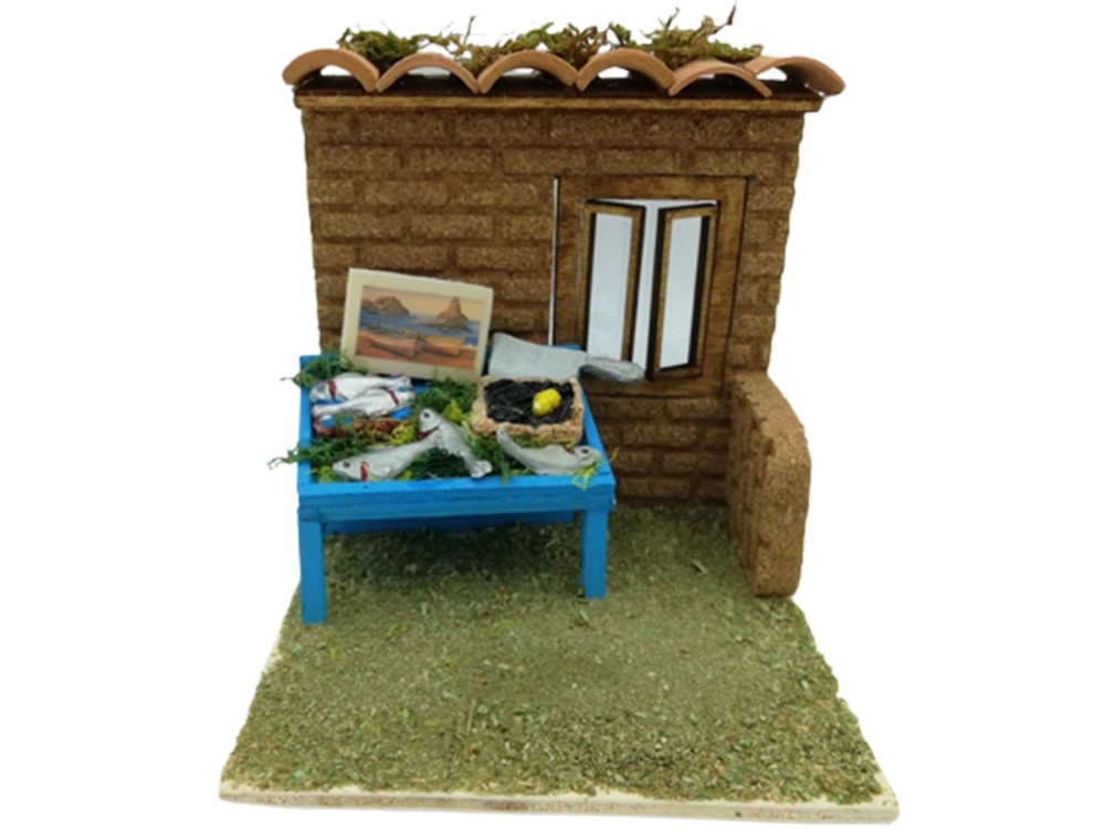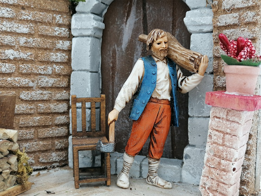 Ambientazione con porta ad arco in gesso e boscaiolo con legna a spalla.