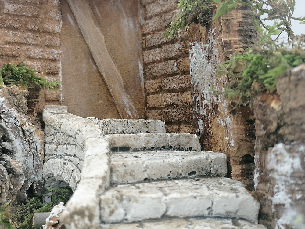 Ambientazione con scala in gesso e casolare in legno e sughero