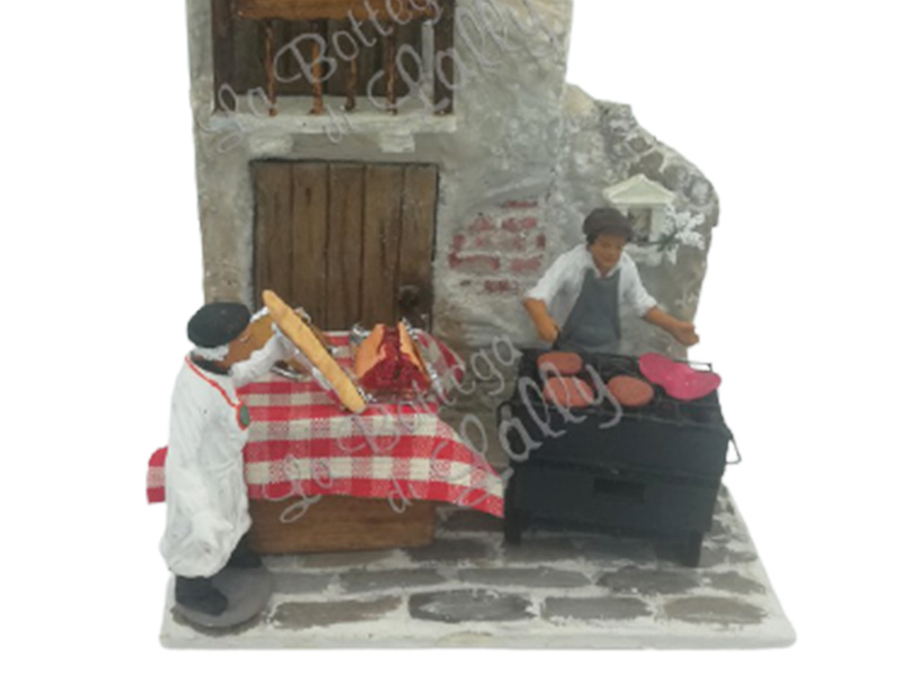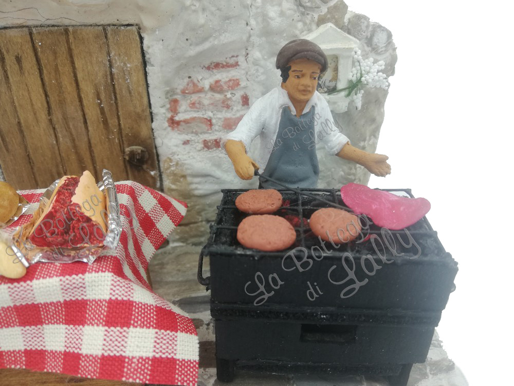 L’ambientazione rappresenta un momento rappresentativo della Festa di Sant’Agata: un uomo che sta arrostendo la carne ed il devoto che si ferma un attimo giusto il tempo per mangiare un panino con la carne di cavallo e recuperare le forze.