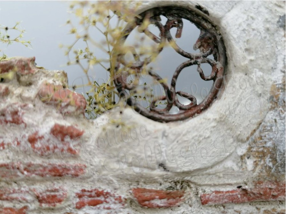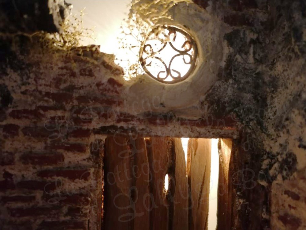 Sopra il portone c’è una finestra realizzata interamente a mano molto particolare nella sua lavorazione. Dietro il portone c’è una luce a 220 W che illumina l’ambientazione rendendola molto suggestiva.