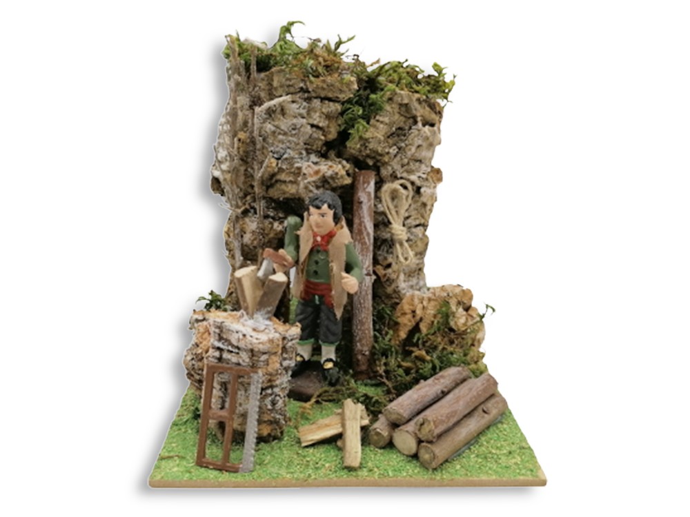 Scena per presepe rappresentante il boscaiolo che taglia la legna. Scena interamente realizzata e dipinta a mano arricchita da tutti i particolari realizzati anch’essi a mano.