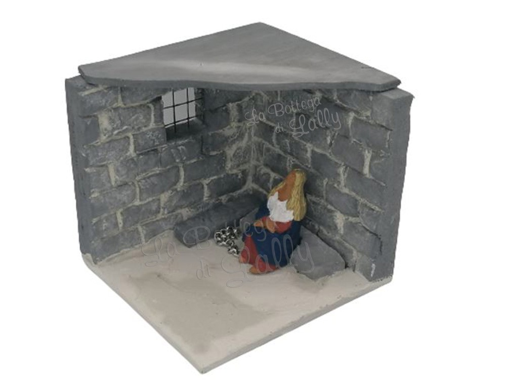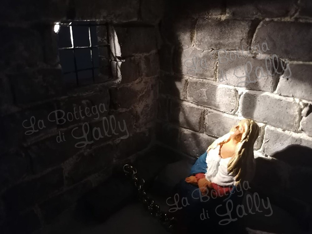 Unica ed Inimitabile riproduzione in miniatura del carcere di Sant’Agata. L’ambientazione è dotata di microlampada con filo con attacco batteria (batteria esclusa). La luce illumina il bellissimo volto di Sant’Agata in Carcere. Tutto interamente realizzato a mano.