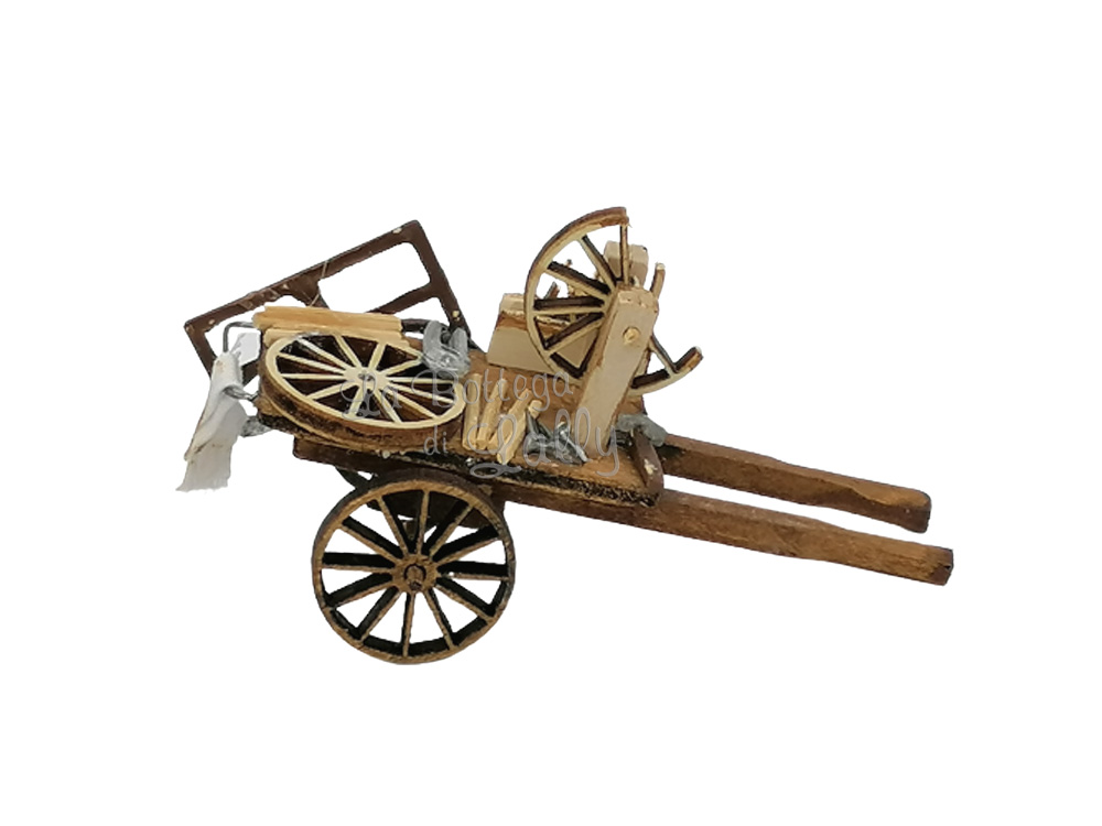 Carretto in legno che rappresenta l’aggiusta ruote, realizzato e dipinto a mano.
