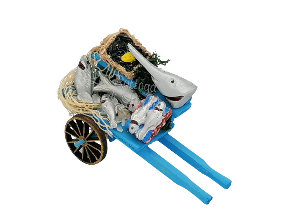 Carretto in legno con il pesce, realizzato e dipinto a mano.