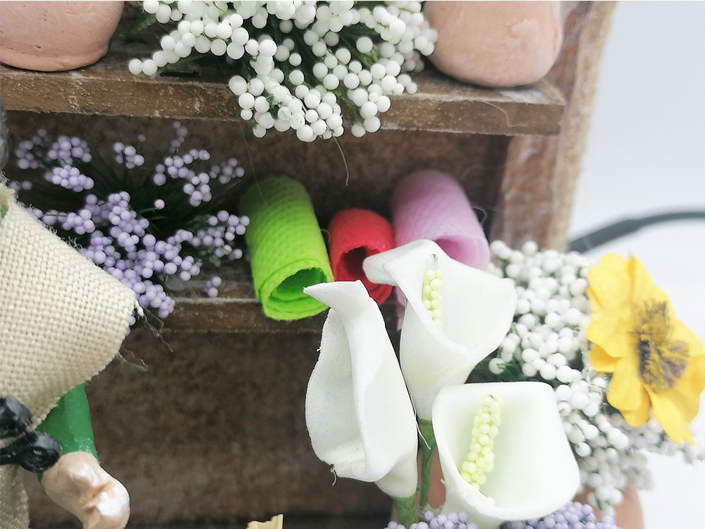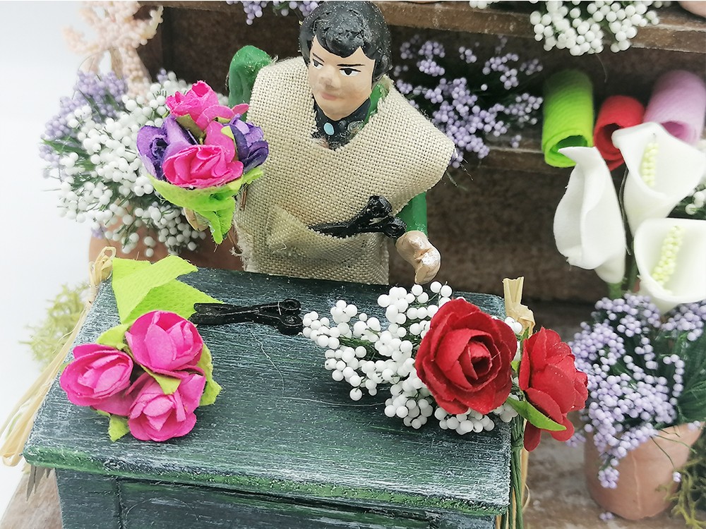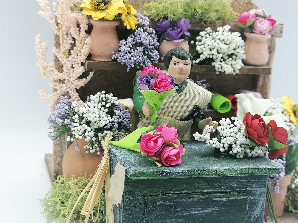 Scena per presepe rappresentante il fioraio in bottega piena di fiori. Scena interamente realizzata e dipinta a mano arricchita da tutti i particolari realizzati anch’essi a mano.