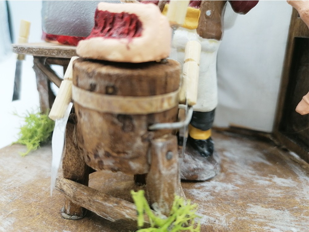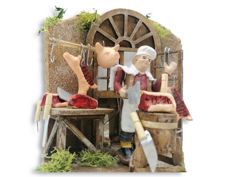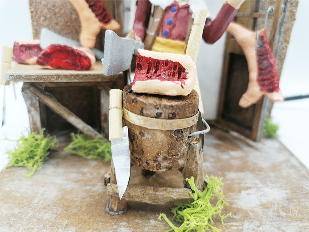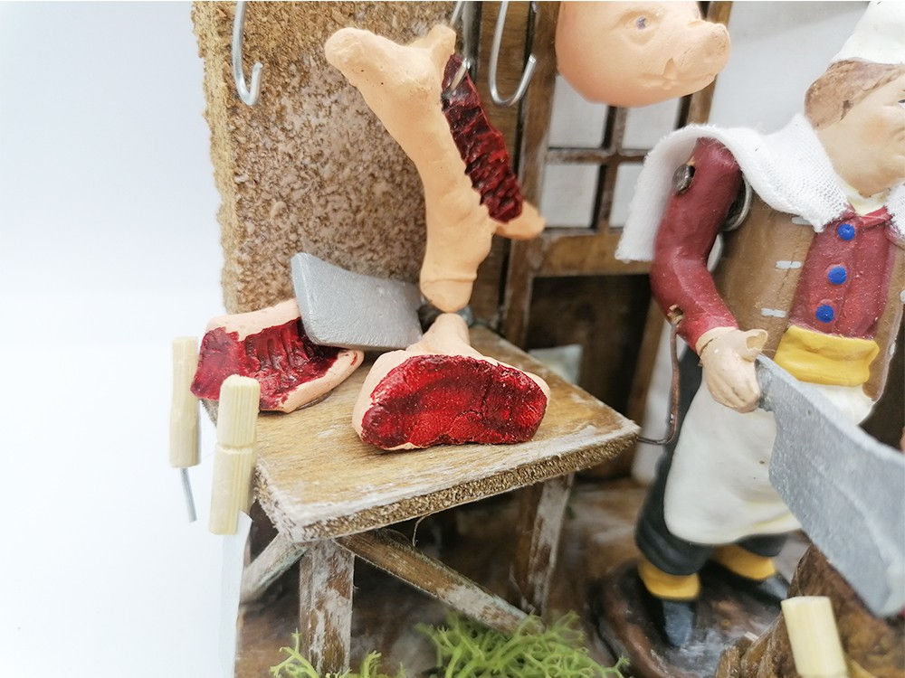 Scena per presepe rappresentante il macellaio che taglia la carne. Scena interamente realizzata e dipinta a mano arricchita da tutti i particolari realizzati anch’essi a mano.
