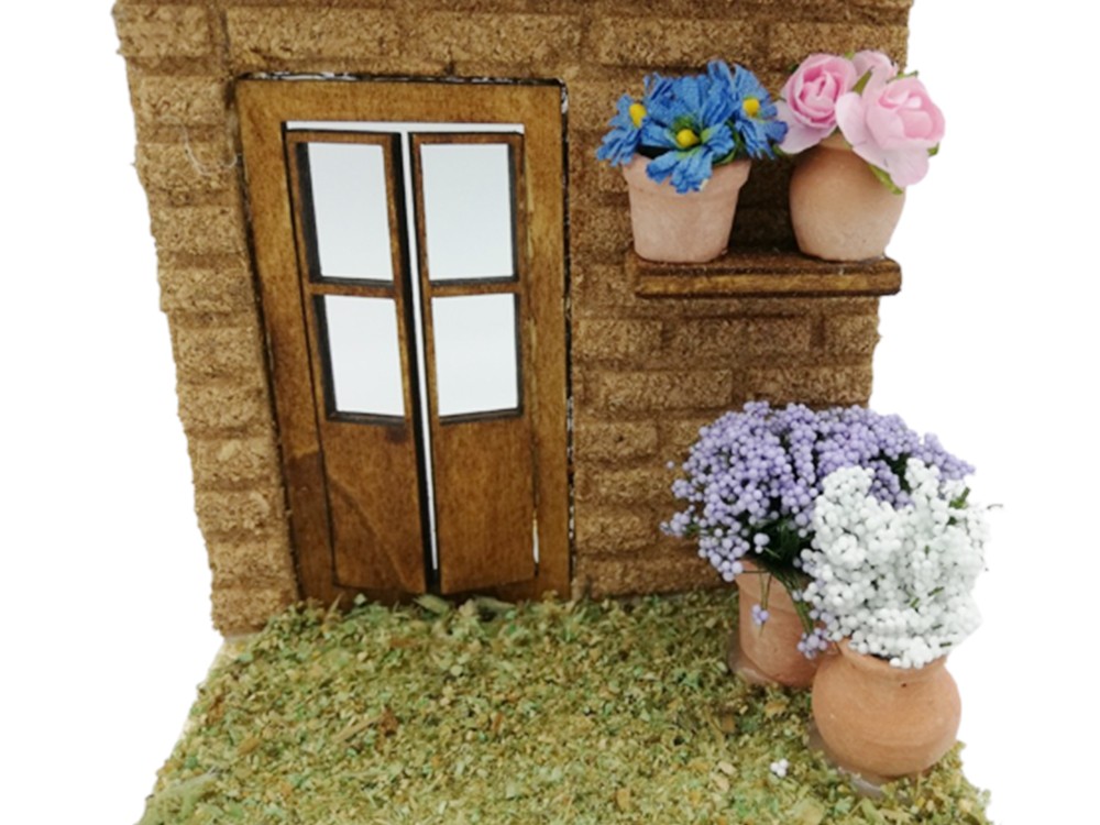 Ambientazione per presepe realizzata in sughero rappresentante la bottega del fioraio.