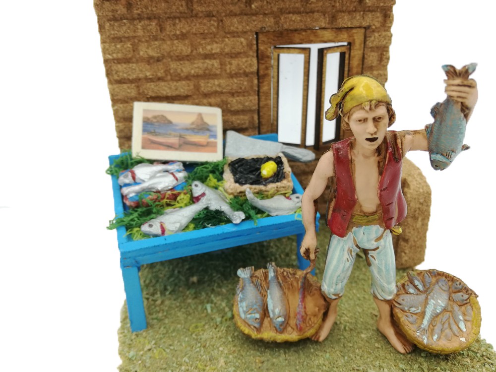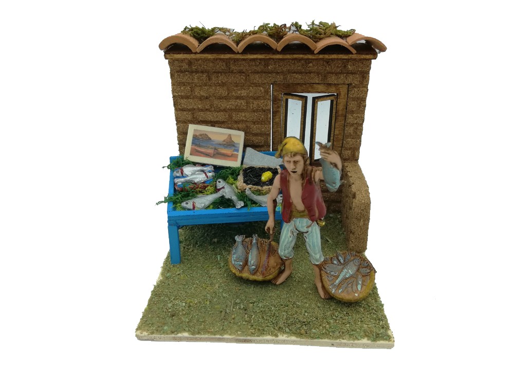 Ambientazione per presepe realizzata in sughero rappresentante la bottega del pescivendolo con banco pesce in legno.