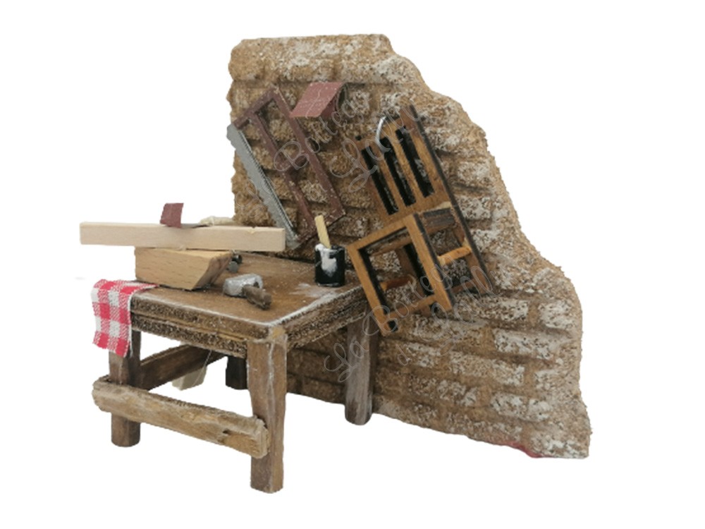 Banco dell’aggiusta sedie in legno con tutti gli attrezzi del mestiere. Sul retro vi è una parete in sughero.