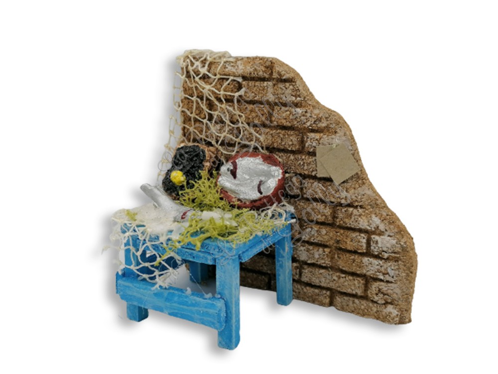Banco del Pescivendolo con tutti gli attrezzi del mestiere. Sul retro vi è una parete in sughero.