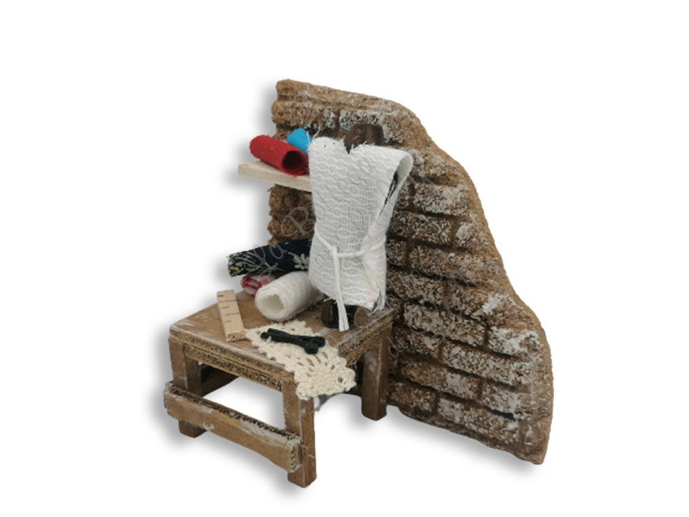 Banco della sarta con tutti gli attrezzi del mestiere. Sul retro vi è una parete in sughero.
