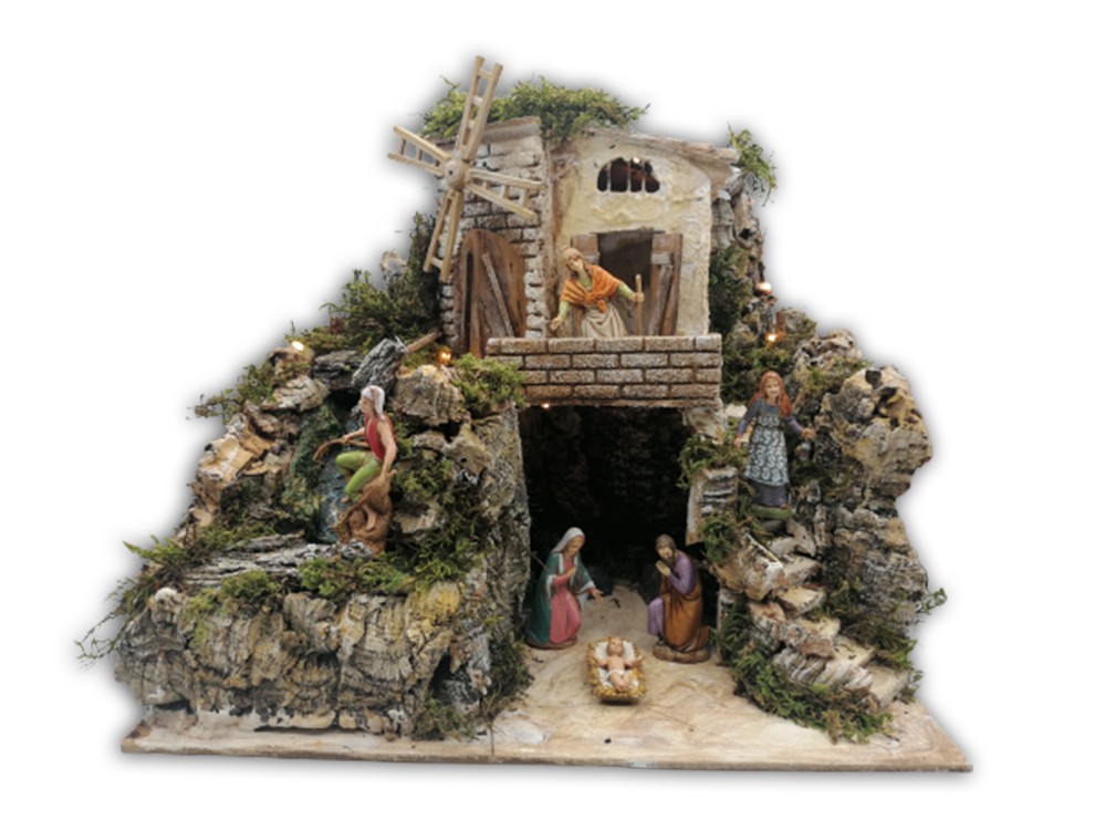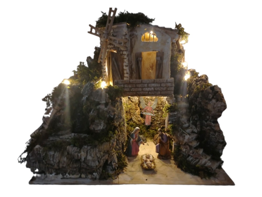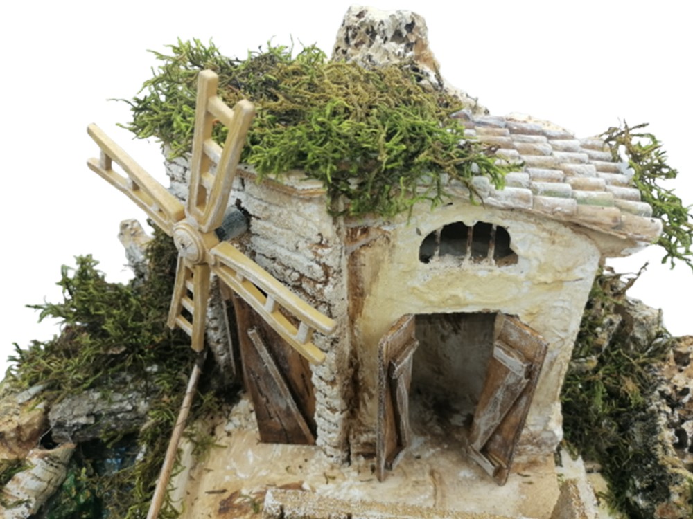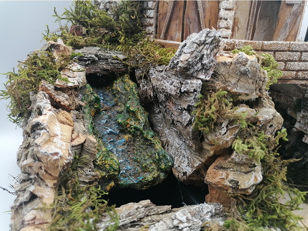 L’ambientazione è arricchita da una cascata suggestiva con pompa acqua 3W 150 lt/h e da una casa con un mulino a vento alimentato da un motoriduttore da 1,2W 10 giri/min.