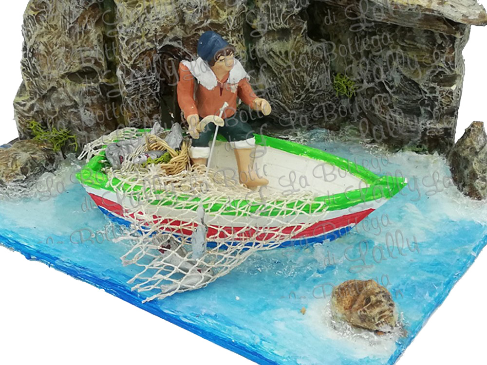Scena per presepe rappresentante un uomo che pesca in mare con gli scogli. Scena interamente realizzata e dipinta a mano.