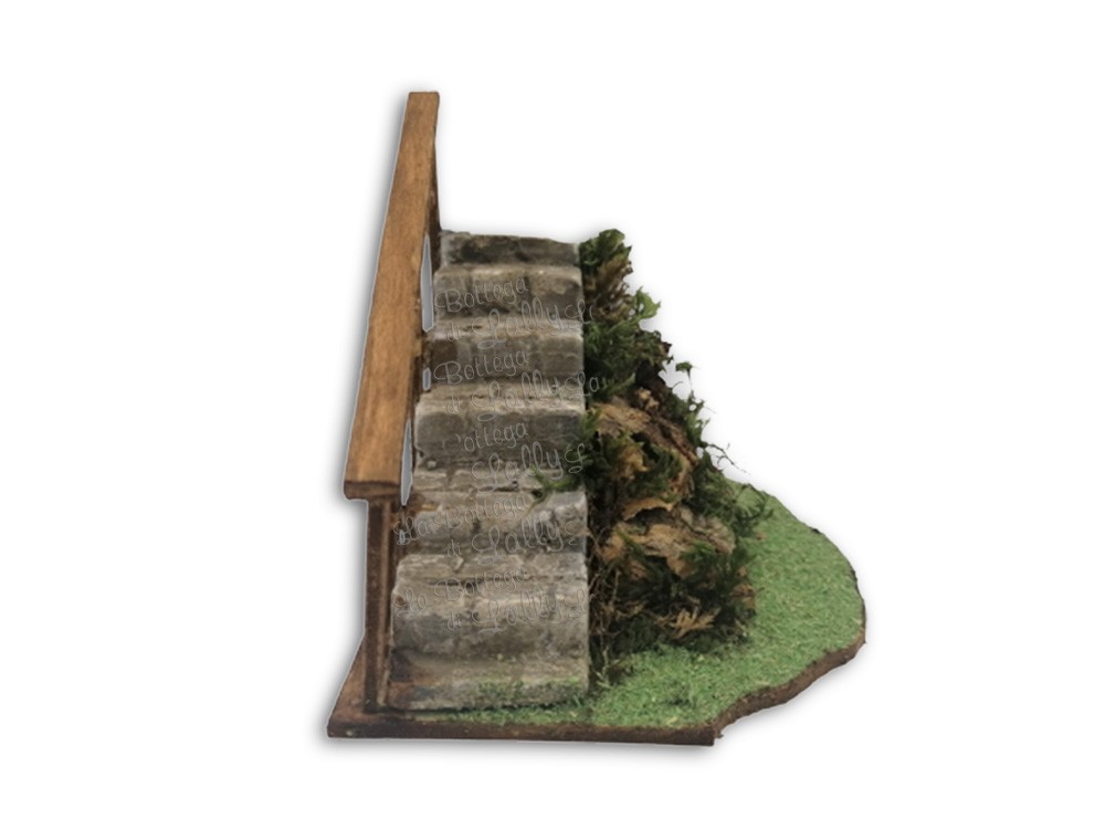 Scala in gesso con ringhiera in legno per presepe popolare. Arricchita da muschio e corteccia
