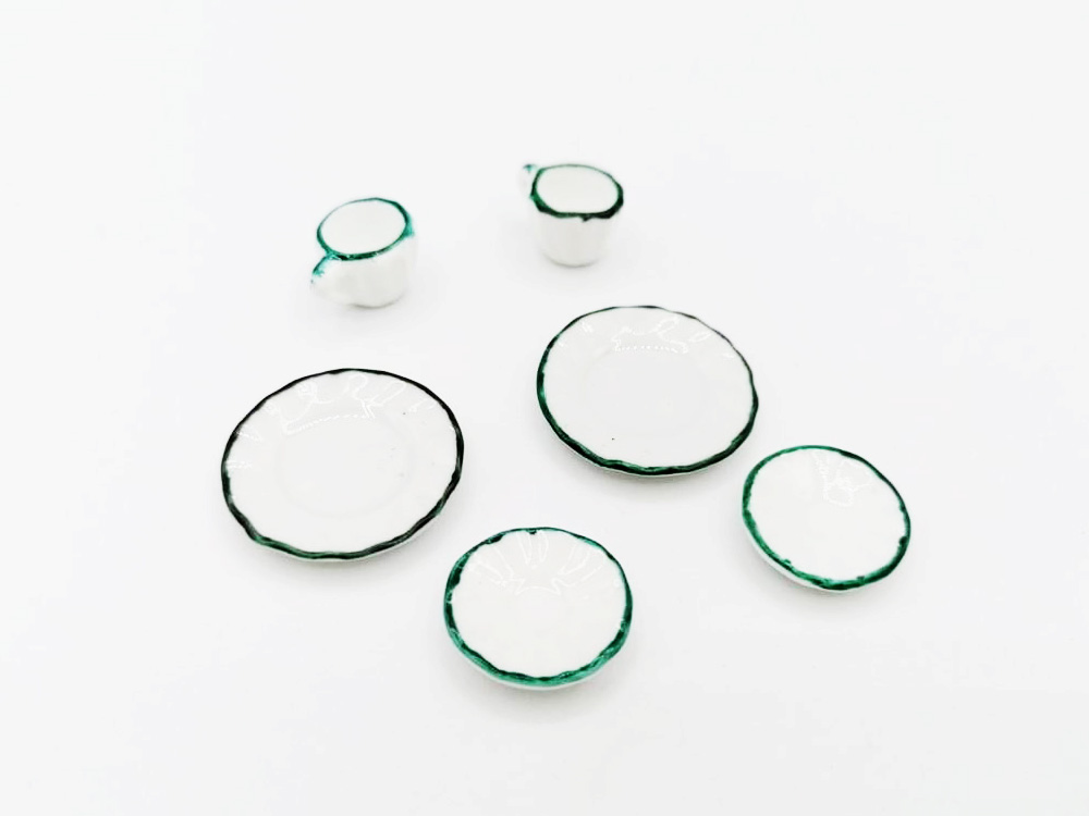 Set 6 pz di piatti e tazzine di porcellana finemente decorati, assortiti verde o blu.