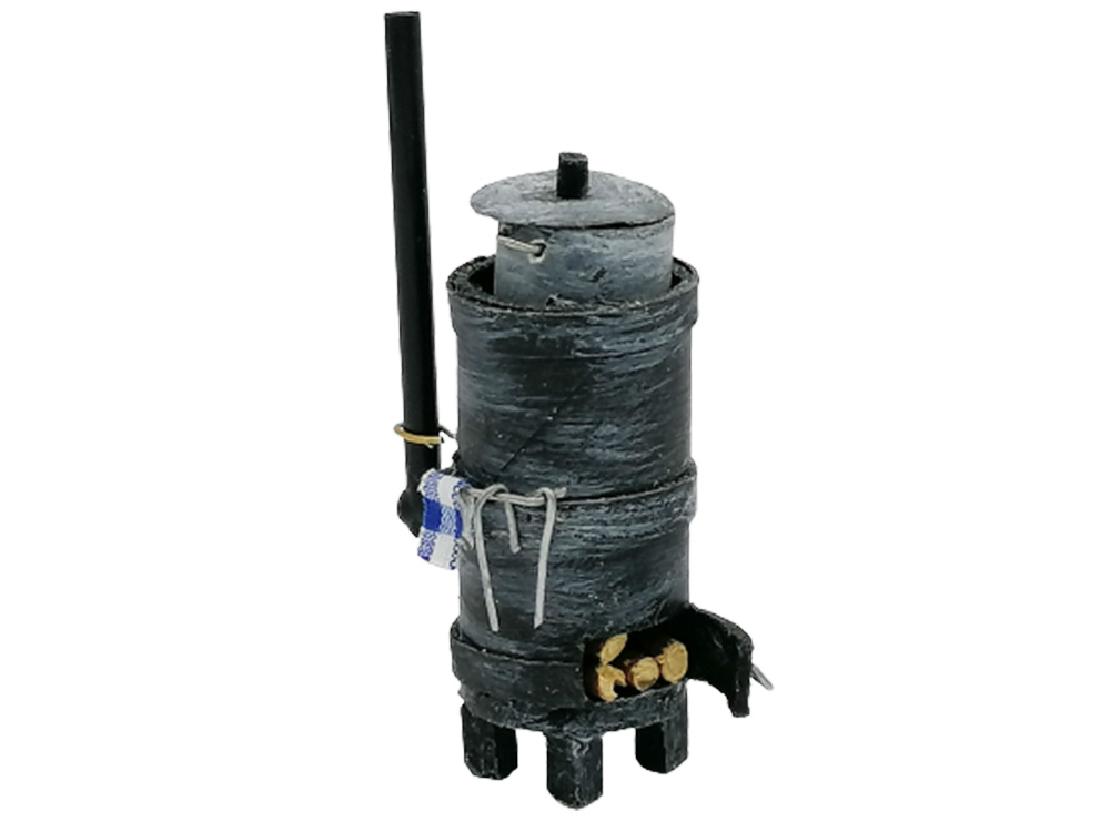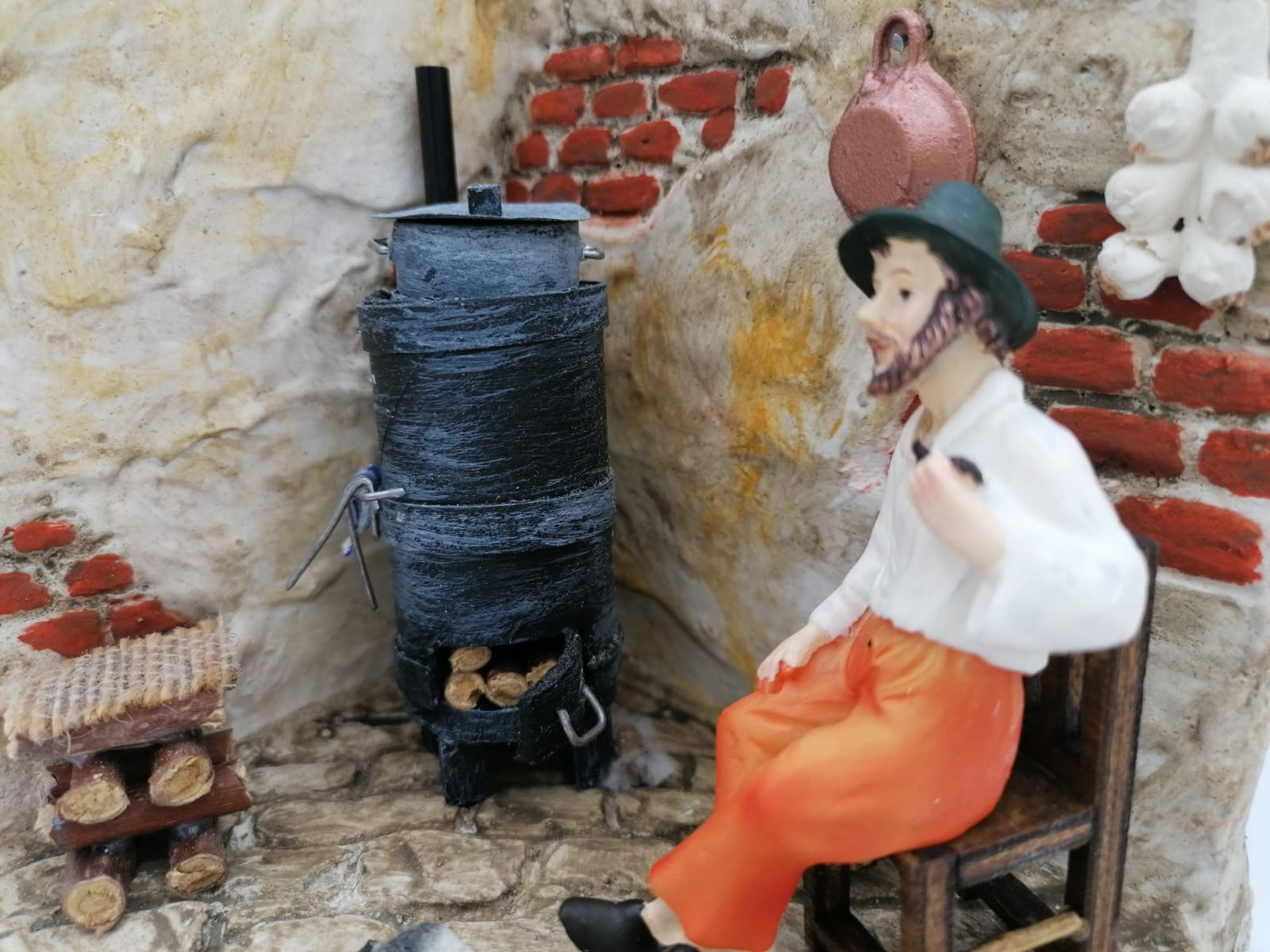 Ambientazione rappresentante una stanza con stufa a legna con un uomo seduto che fuma la pipa ed il gattino che gli fa compagnia.
