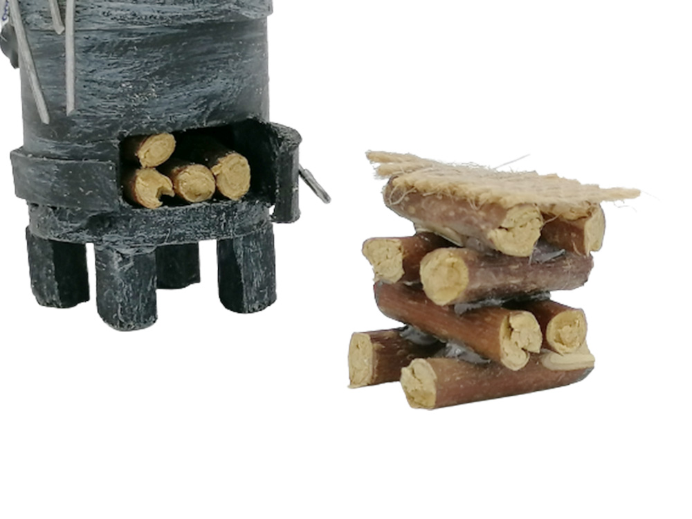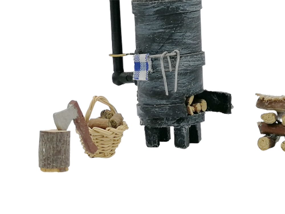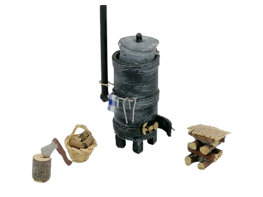 Riproduzione di una antica stufa a legna adatta a statue 8/12 cm completa di pentola ed accessori vari.